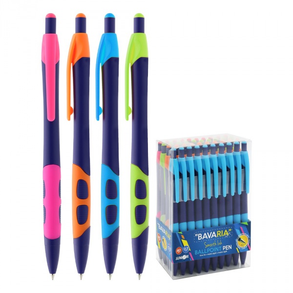Kuličkové pero s plastovým tělem, profilovaný, gumový úchop pro pohodlné držení pera při psaní, tělo pera s úpravou Soft touch, šířka stopy 0,7mm, modrý inkoust.