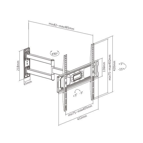 Výsuvný nástěnný držák LPA69-443 je určen pro instalaci TV s plochou obrazovkou s úhlopříčkami od 32“ do 55“. Jeho největší přednostní je robustní výsuvná konstrukce, díky níž unese TV o hmotnosti až 35 kg a zároveň umožňuje nastavit vzdálenost TV od stěny v rozsahu 82 mm až 485 mm, samozřejmostí je pak také velký rozsah polohování. Držák umožňuje snadné naklápění TV v rozsahu +5°~-15°, natočení do stran v rozsahu +90°~-90° a rotaci v rozsahu +3°~-3°, což maximalizuje flexibilitu sledování z libovolného místa v místnosti. Integrovaná svorka na kabely udržuje kabely uspořádané a chráněné.