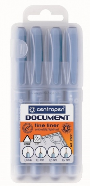 Centropen liner 2631/0,1-0,7mm/4kusy sada. Zvlášť vhodný k vytahování, skicování, technickému kreslení. Plastový hrot v kovové trubičce. Liner je plněn dokumentním světlostálým a vodě odolným inkoustem, vhodným pro kopírování. Linery 2631 mohou využít konstruktéři, návrháři, designéři, výtvarníci, grafici, geodeti, ... Délka stopy 500 až 600 m.