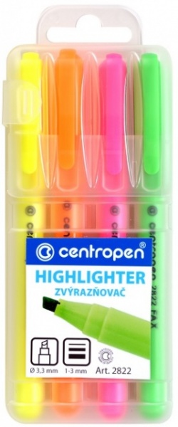 Praktické provedení oblíbených zvýrazňovačů. Zvýrazňovač je osazen klínovým hrotem, který vytvoří stopu písma šíře 1-3 mm, je plněn fluorescenčním inkoustem vhodným nejen na všechny druhy běžných papírů, ale i na papíry kopírovací a faxové. Chránítko je opatřeno praktickým klipem, odolnost zvýrazňovačů proti vyschnutí je min. 3 roky.