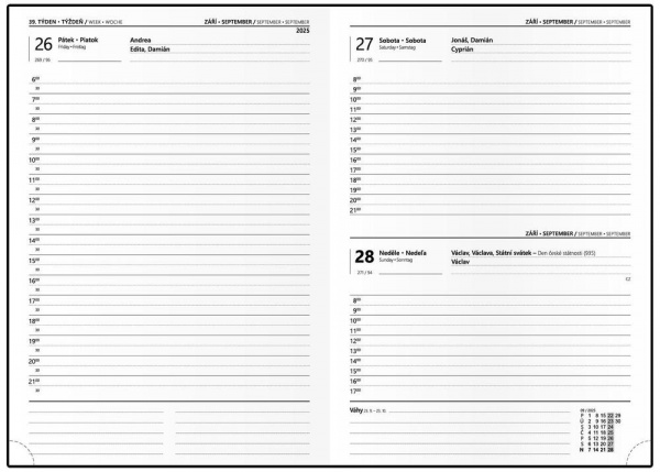 osobní údaje, přehledný kalendář aktuálního roku a následujícího roku, měsíční plánování aktuálního roku, plán dovolených aktuálního roku, přehled státních svátků a významných dnů CZ/SK, jmenný seznam CZ/SK, daňový kalendář CZ/SK aktuálního roku, mezinárodní svátky, důležitá telefonní čísla, roční plánovací kalendář CZ/SK aktuálního roku, místo pro poznámky, mapa CZ/SK, zadní předsádka - kapsa