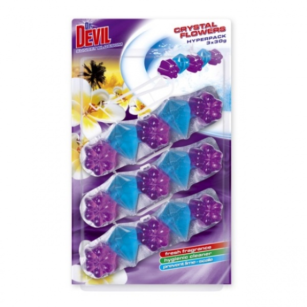 Dr. Devil Wc BiColor 5Ball je závěsný WC blok vhodný pro každý typ a tvar toalety, WC blok bohatě pění, svěže a intenzivně voní, účinně čistí a preventivně působí proti usazování vodního kamene.