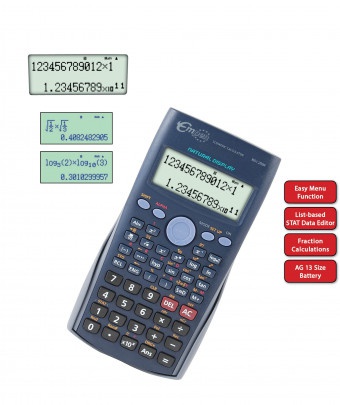 Vědecká kalkulačka s dvouřádkovým displejem. Automatické vypínání. Rozměry: 84x163x17 mm.