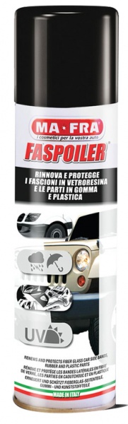 Jedná se o sprej, který jedním "rázem" obnoví - aniž by umastil - nárazníky, boční lišty, spoilery a kapoty. Je bohatý na vzácné a výživné látky na bázi polymerů a vytváří lesklou, transparentní a ochrannou vrstvu. Tato vrstva od FASPOILER pevně přilne k ošetřované ploše, prakticky okamžitě obnoví plastové povrchy vyztužené skelnými vlákny (boční lišty a nejen ty), plasty - vybledlé či poškozené dlouhým vystavením slunečním paprskům - či jakoukoliv gumovou součást. Pokud používáte FASPOILER pravidelně, potom předejde vyblednutí a zestárnutí odkrytých a nechráněných částí. Vrstva vytvořená na povrchu ošetřované části vydrží nějakou dobu působení vlivu studené a teplé vody, slunce a prachu, aniž by na sobě nechala znát nepříjemné ""popraskání"" a zároveň zůstane neviditelná.
