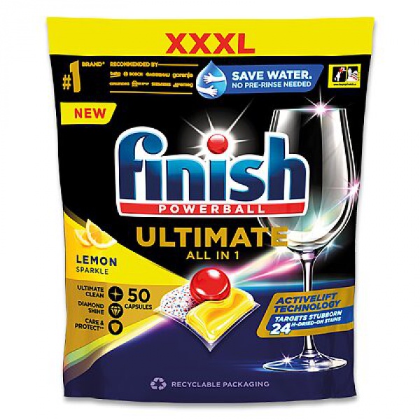 Složení kapslí do myčky FINISH POWERBALL ULTIMATE se třemi komorami má sílu hloubkového čištění, zanechává diamantový lesk bez předmáčení, účinně odstraňuje všechny druhy zbytků jídla, také zaschlé po dobu 24 hodin, a to vše bez předoplachu.