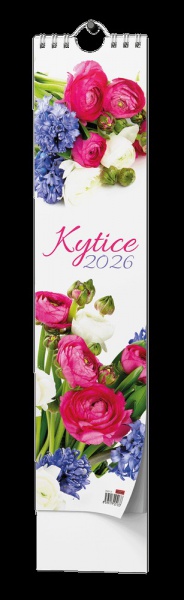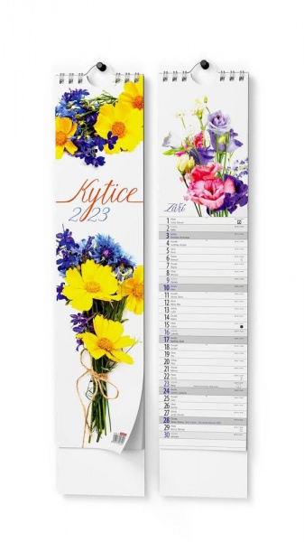 Netradiční nástěnný kalendář ve formátu kravaty s působivými obrázky kytic.