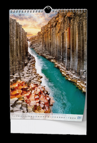 Nástěnný kalendář s obrázky působivých řek a přírodních scenérií.