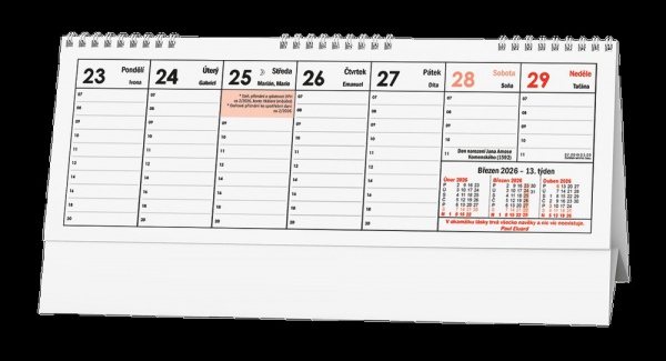 Dělená kovová spirála „twin wire“. Obálky jsou tištěny na kvalitní křídový papír a jsou povrchově upraveny lesklým UV-lakem proti otěru. Vnitřní listy jsou tištěny na speciálním papíru v gramáži 90 až 115 g/m2 (stolní pracovní kalendáře jsou tištěny na ofsetový papír v gramáži 70 g/m2). Vhodné pro psaní perem, tužkou. Formát: 285 x 104 mm, počet stran: 57, kalendárium: české týdenní jmenné, měsíční fáze, roční období, letní a zimní čas, citát na každý týden.