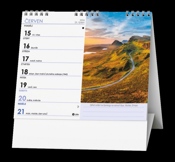 Dělená kovová spirála „twin wire“. Obálky jsou tištěny na kvalitní křídový papír a jsou povrchově upraveny lesklým UV-lakem proti otěru. Vnitřní listy jsou tištěny na speciálním papíru v gramáži 90 až 115 g/m2 (stolní pracovní kalendáře jsou tištěny na ofsetový papír v gramáži 70 g/m2). Vhodné pro psaní perem, tužkou. Formát: 165 x 135 mm, počet stran: 57, kalendárium: české týdenní jmenné, měsíční fáze, roční období, letní a zimní čas, informační stránky obsahují: abecední seznam jmen, tabulkový kalendář.