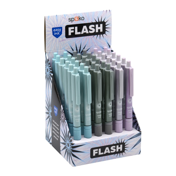 Stiskací kuličkové pero řady FLASH s příjemným pogumovaným úchopem pro komfortní držení a psaní. Tělo má čistý design v pastelových barvách. Logo natištěné na těle pera. Modrá náplň Easy Ink - inkoust s nízkou viskozitou pro pohodlnější a plynulejší psaní.