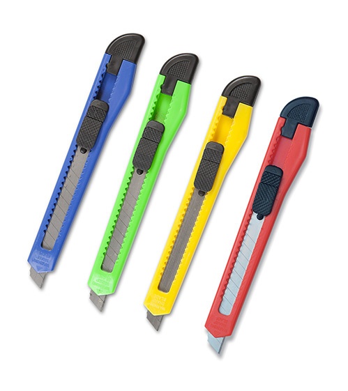 Odlamovací nůž s plastovým tělem, mix barev, možnost výměny nožů, uzavírací pojistka, protiskluzový povrch, šířka čepele 9mm. Délka 13 cm.