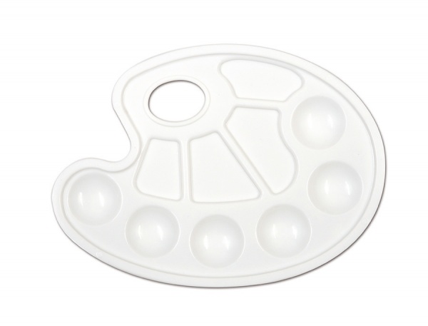 Bílá malířská paleta s 6-ti miskami pro barvy a 4 miskami pro míchání barev. Vyrobená z odolného nepraskavého plastu. Rozměry palety: 23 cm (širší strana) x 17 cm (užší strana).