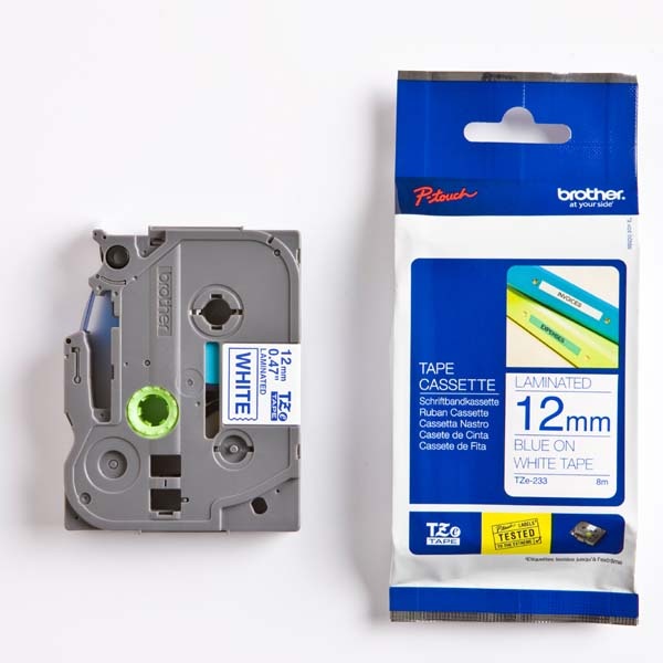 Brother originální páska do tiskárny štítků, Brother, TZE-233, modrý tisk/bílý podklad, laminovaná, 8m, 12mm.