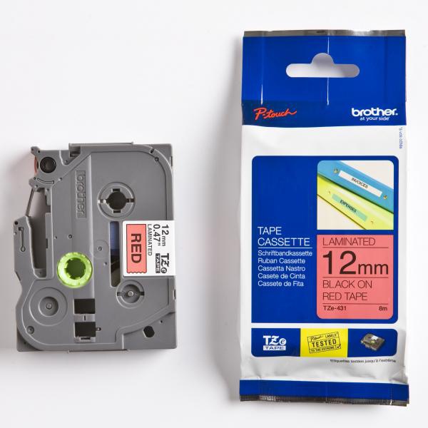 Brother originální páska do tiskárny štítků, Brother, TZE-431, černý tisk/červený podklad, laminovaná, 8m, 12mm, extrémně adhezivní.