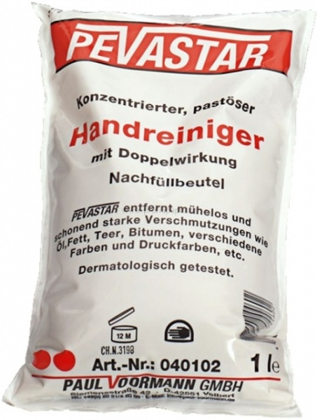 Mycí pasta Pevastar, 1litr, abrazivní. Účinná mycí abrazivní pasta. Spolehlivě působí na tuky, oleje, dehty, asfalt, barvy, tiskařské barvy a pryskyřice. Neutrální pH a speciální přísady brání vysoušení rukou. Neobsahuje alkalické látky a nepůsobí potíže v odpadních systémech.