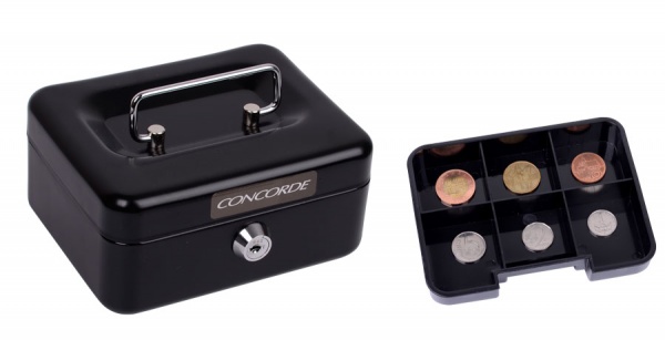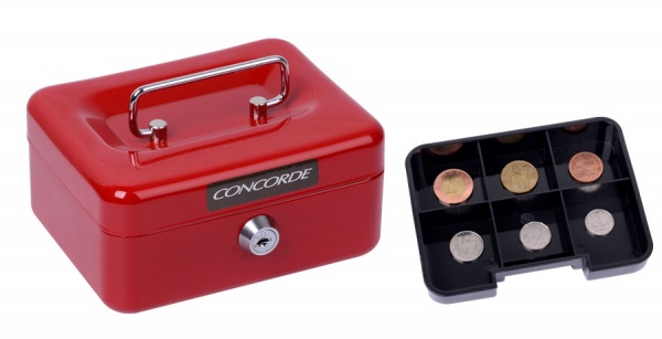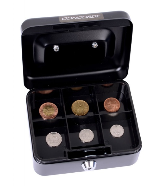 Kovová pokladna vyrobená z bezešvého ocelového plechu, přihrádka na mince, uzamykatelná, přenosná.