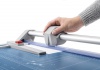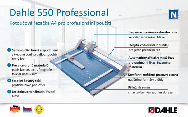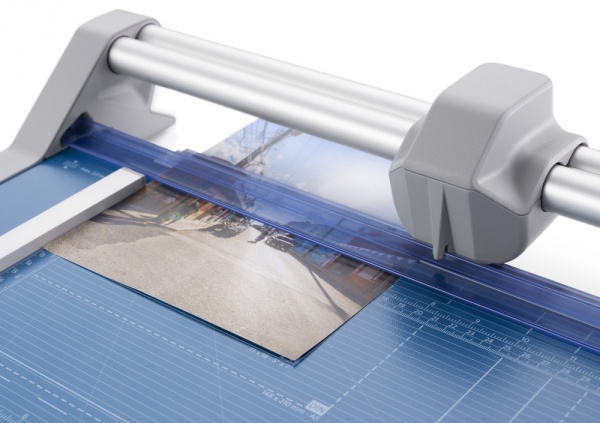 Profesionální kotoučová a velkoformátová řezačka pro každodenní použití. Samo-ostřící horní a spodní nůž z tvrzené oceli pro dlouhodobě přesný řez. Určeno pro více druhů materiálů: papír, karton, textil, fotografie a fólie. Uzavřená hlava nože s vylepšenou ergonomií těla zajišťuje vysokou míru bezpečnosti. Stabilní rozšířený kovový stůl s neklouzavými pryžovými podložkami. Nová dvojitá vodící lišta z hliníku pro ještě přesnější řez. Natištěné úhly a DIN formáty usnadňují vyrovnání řezaného materiálu. Dva příložníky s dělením v mm a nastavitelným zadním dorazem pro fixaci řezaného materiálu a 90° řez. Automatický přítlak v místě řezu pro rychlé zafixování řezaného materiálu. Pro úsporu místa možnost montáže na stěnu. Dodáváno včetně montážního klíče pro výměnu kotoučové hlavy. Lze dokoupit: náhradní řezací hlava. Vyrobeno v ČR.