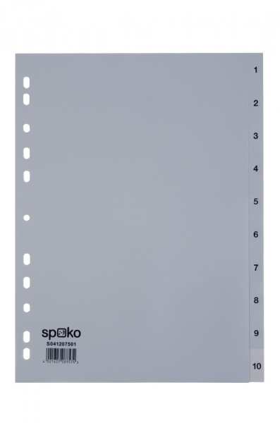Praktický rozlišovač formátu A4 vyrobený z ekologicky šetrného PP v šedé barvě. Potisk číselným registrem: 1 - 10. Univerzální euroděrování pro pákové i kroužkové pořadače.