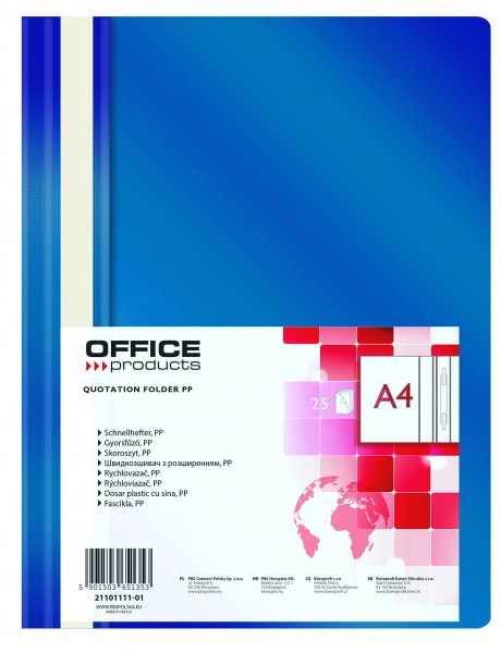 Rychlovazač se zesileným obalem pro dokumenty formátu A4. Vyroben z ekologicky šetrného polypropylenu - síla materiálu: 100 μm (přední strana) a 170 μm (zadní strana). Kapacita: 2 cm (cca. 200 listů). Oboustranný popisovatelný štítek. Rozměry: 225×305 mm.