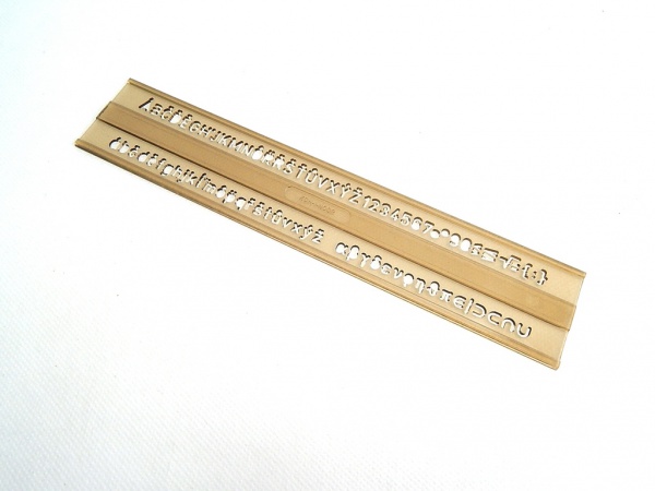 Písmenková šablona vyrobená z kouřového průhledného polystyrenu. Je určena pro práci s ohrocenou tužkou nebo mikrotužkou. Obsahuje znaky velké a malé abecedy, číslic, matematických znaků a řecké abecedy. Veškeré znaky jsou velikosti 5 mm. Šablona je určena k popisování hlavně ve škole, ale i v kanceláři.