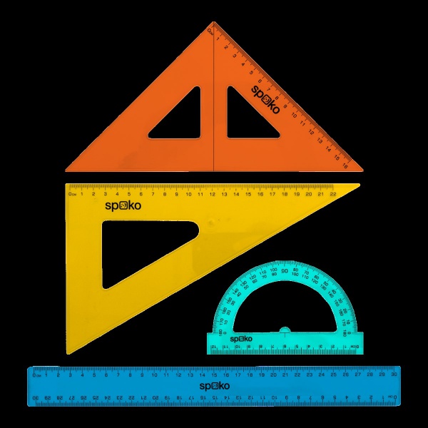 Čtyřdílná sada pravítek, určená pro školní geometrii. Sada obsahuje ploché pravítko, trojúhelník s ryskou, úhloměr, pravoúhlý trojúhelník. Balení s euro závěsem.