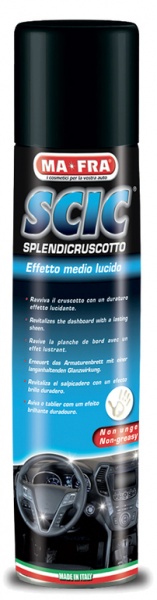 Autokosmetický čistič palubní desky MA-FRA Scic Blue je oživující přípravek se středním leskem a dlouhodobým účinkem. Leští, chrání a obnovuje původní vzhled všech vnitřních plastů, gumových povrchů a jiných syntetických materiálů jako je umělá kůže a koženka. Autokosmetický čistič palubní desky MA-FRA Scic Blue dokáže i mnohem víc - je perfektní také na dřevěné palubní desky, v domácnosti najde použití jako ochrana a oživující prostředek na cenné vykládané kusy nábytku. Autokosmetický čistič palubní desky MA-FRA Scic Blue obsahuje cenné silikony, které působí proti usazování prachu, chrání ošetřované části a propůjčují jim hebkost, živost a po dlouhou dobu také přirozený vzhled. Mimo to rozzáří povrch palubní desky, aniž by vytvořil mastný efekt nebo nepříjemné odlesky v celním skle.