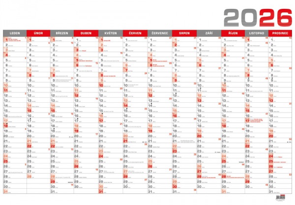 Formát: 964×670 mm, složeno na formát B4 - 241×335 mm Kalendárium: české roční jmenné, měsíční fáze, roční období, letní a zimní čas.
