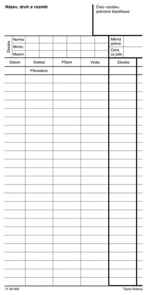 Skladová karta 1/3 A4/1ls. Do tiskopisu se zaznamenává název, druh a rozměr skladovaného materiálu.
