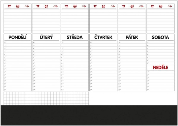 Papírová stolní psací podložka, černá plastová lišta - výška 60 mm. Odtrhávací listy (blok). Týdenní plánovací kalendář. formát: A2 - 594 × 420 mm. Počet listů: 50.