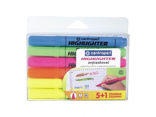 Velkokapacitní zvýrazňovač, fluorescenční pigmentový inkoust, na všechny druhy papíru, klínový hrot, šířka stopy 1–4,6 mm.